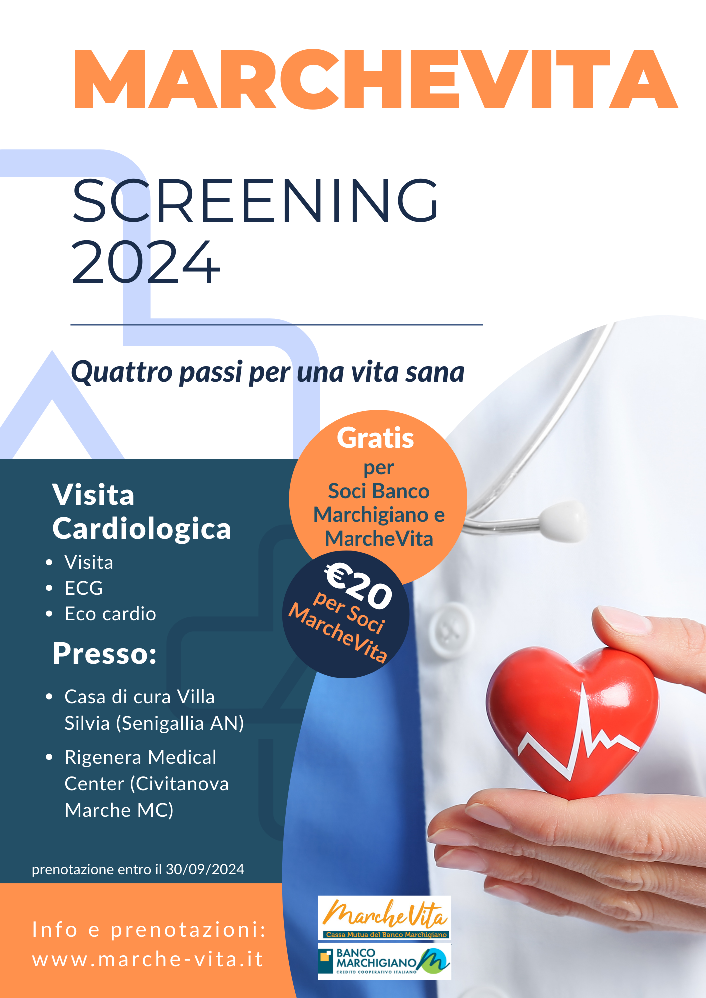 Abbiamo scelto con cura centri medici specialistici di riferimento per condurre ogni screening, basandoci sulla loro professionalità e sulla collaborazione consolidata nel lungo percorso di sostegno al miglioramento delle condizioni di salute dei nostri soci, partecipare a questi screening è un passo importante verso una vita più sana e un futuro più sereno. MarcheVita offre questa possibilità a tutti i soci fino al 30/09/2024. La campagna non è aperta ai famigliari.